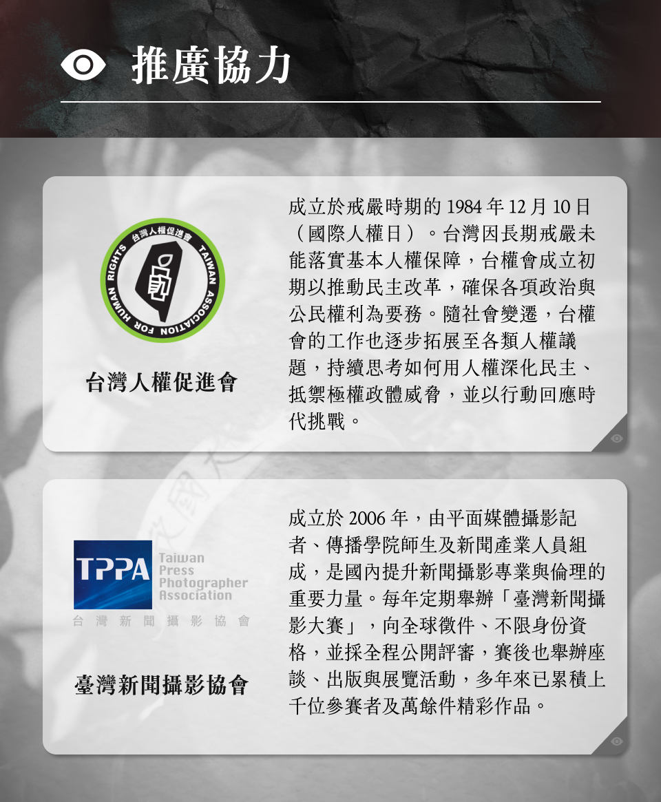 40 年前,台灣出現一群滿腹理想與正義感的攝影記者。他們在街頭衝撞、拍攝了野百合學運、反軍人干政、反核四運動、首屆省市長選舉、總統直選、96 台海危機、反五輕運動、原住民族還我土地運動、勞工運動、媒體改革運動…,這些改變台灣歷史的事件中,他們從不缺席。