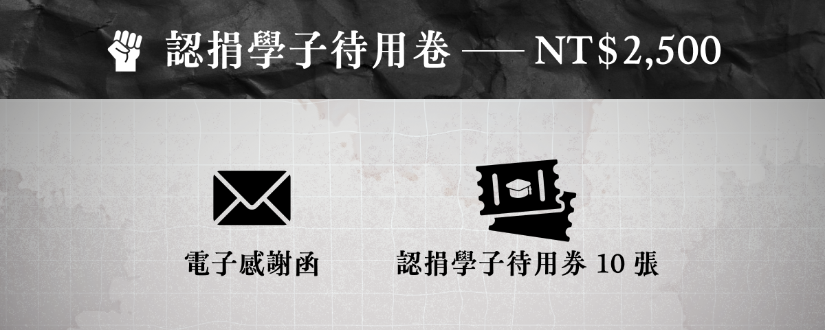 我們將在獨立書店、藝文空間設立「學子待用券」據點,學生可憑學生證免費領取觀賞券一張,並於 12 月底至指定場次觀賞《民主之眼》。實際執行方式視認捐、領取數量及場地狀況而定,場次資訊將於社群另行公告。