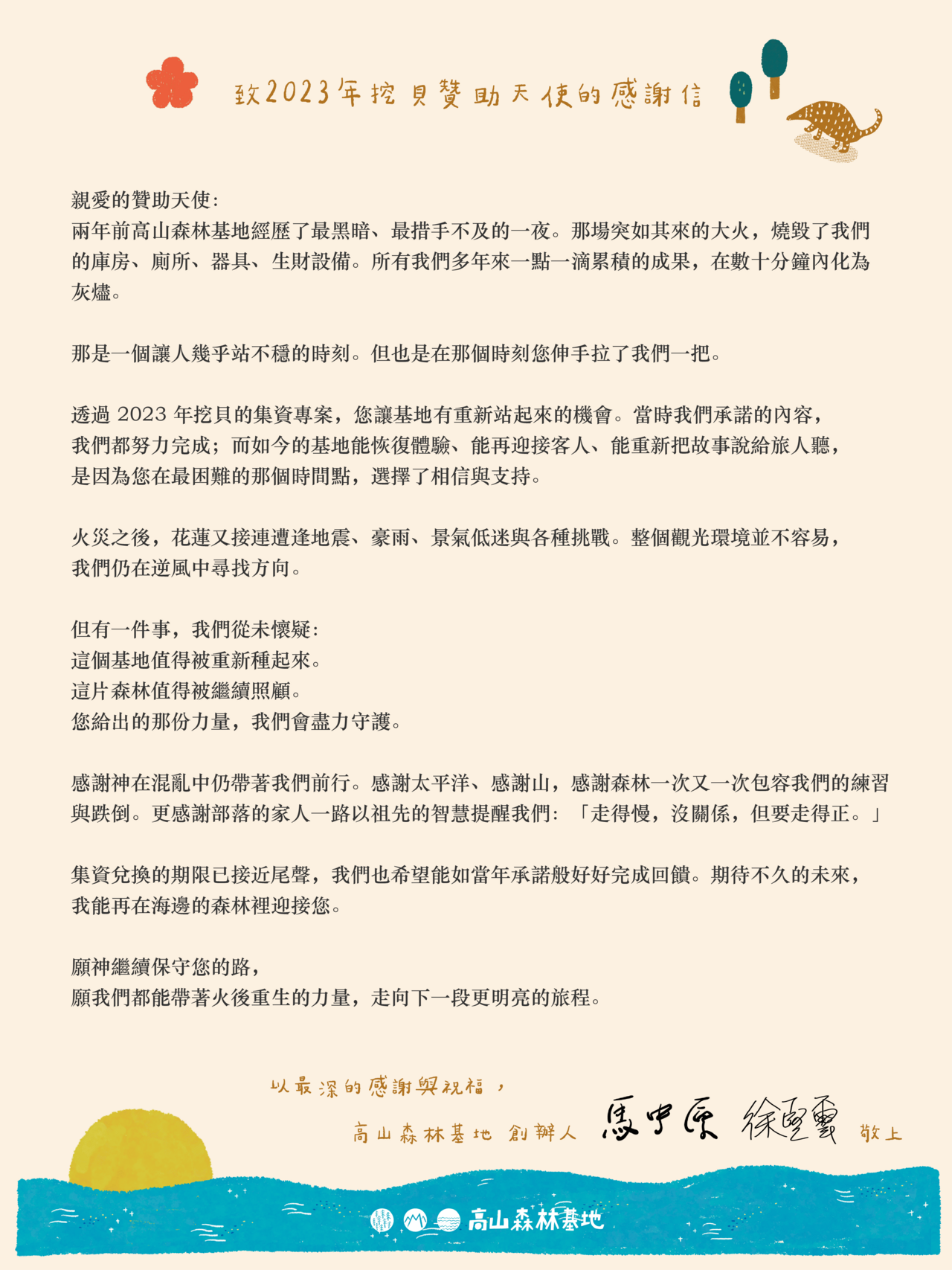 謝謝您在 2023 年災後支持高山森林基地,我們準備了一份信,想向您表達我們的感謝。