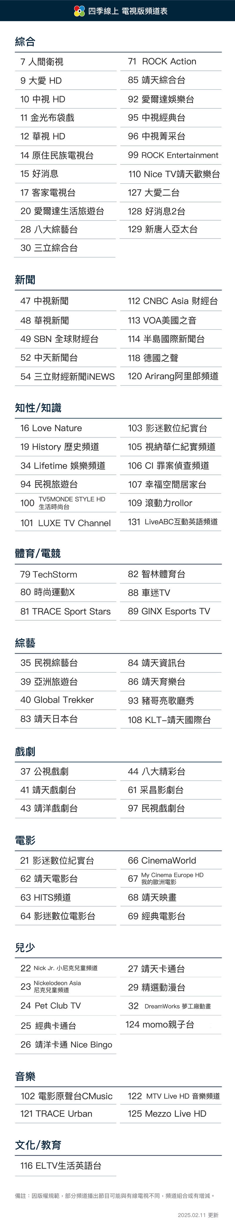 *開機直接看正版免費頻道;串流第四台近百頻道每月只要99元!點擊查看頻道表