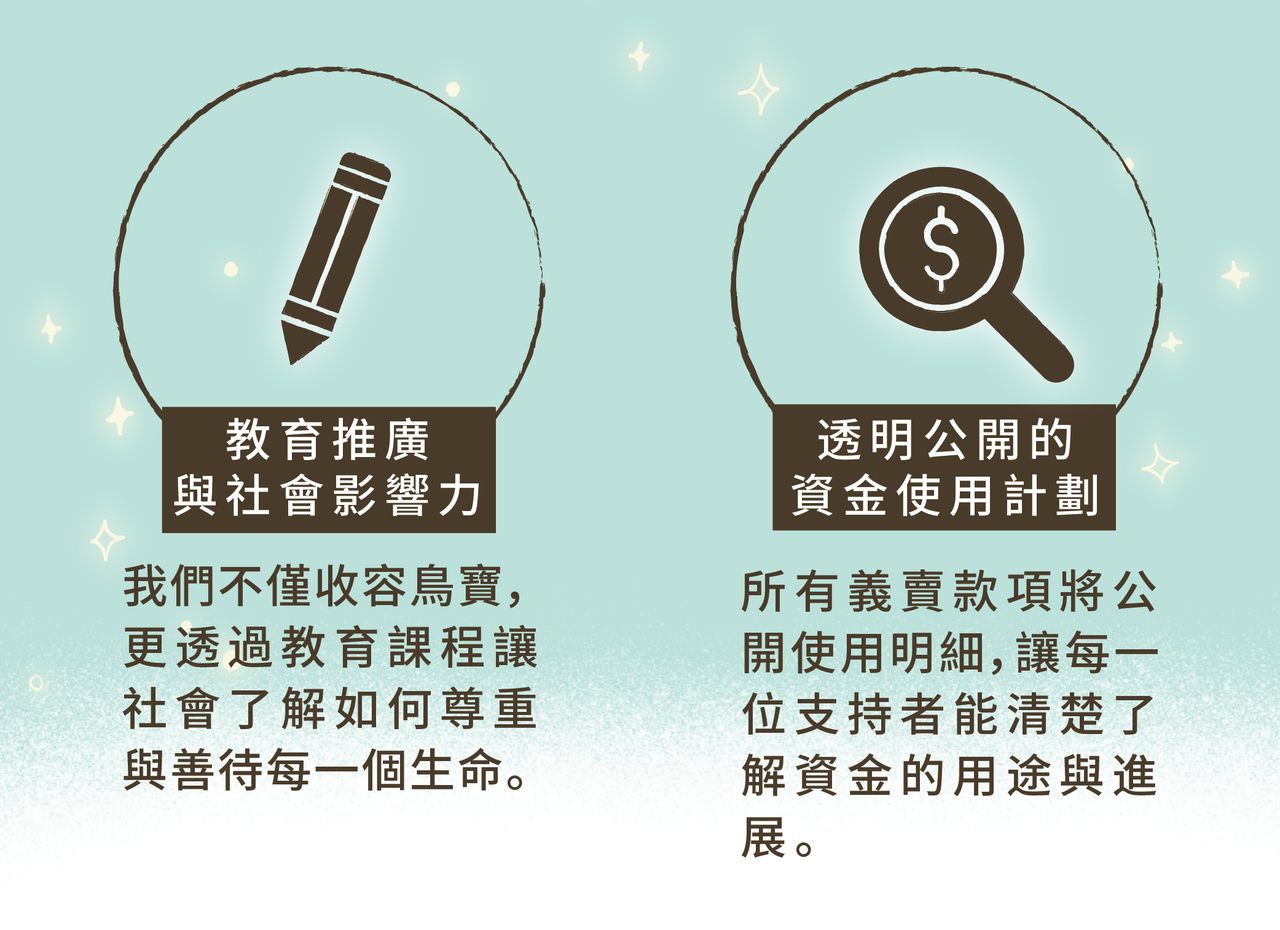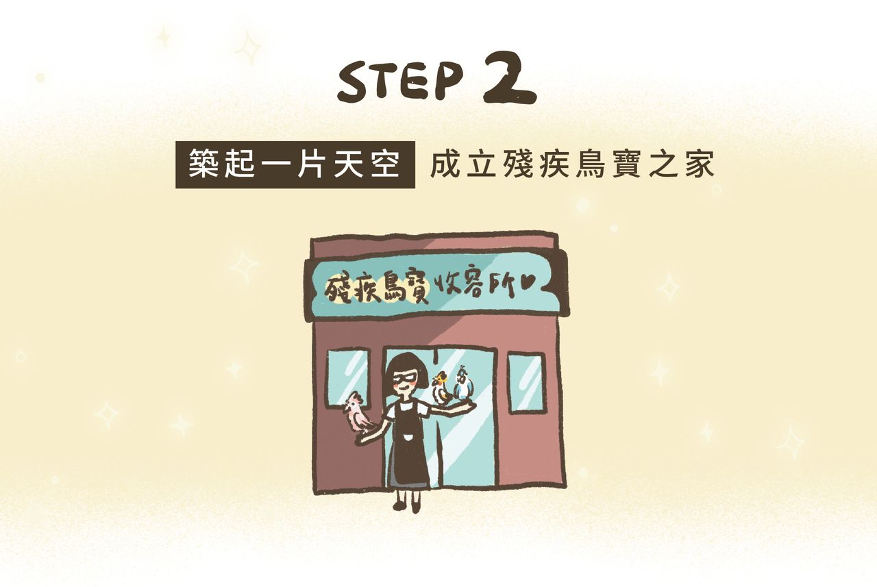 我們計畫租借一處場地,建設一個更完善的「殘疾鳥寶收容所」,讓牠們擁有更多活動空間,並接受專業的照護與康復訓練。