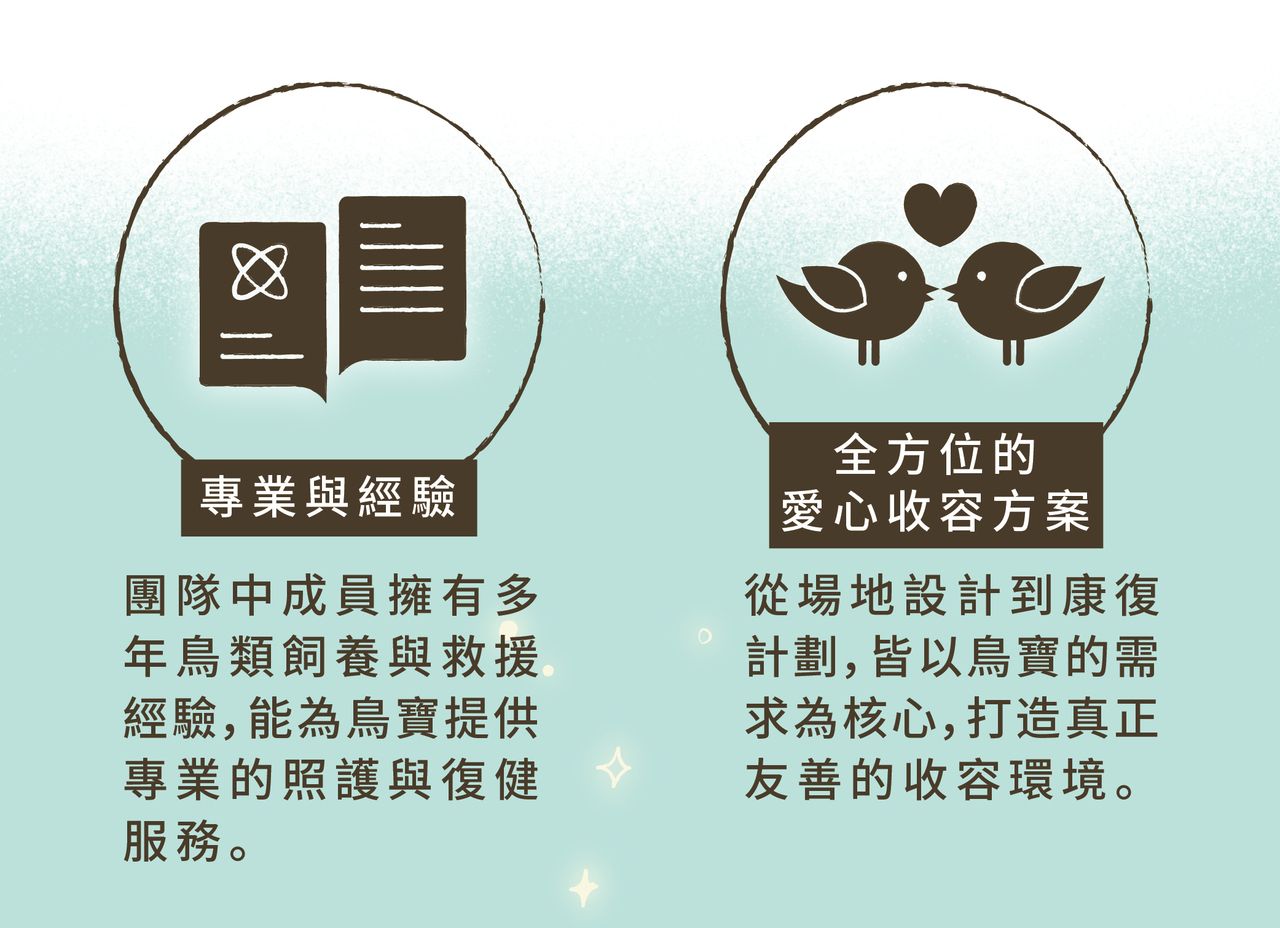 理想場地設計:開放式飛行區域:讓鳥寶能夠自由活動,恢復自然本能。專屬康復室:協助牠們進行身體復健,改善生活品質。安靜療癒空間:為曾經受過驚嚇的鳥兒提供安心休憩的角落。