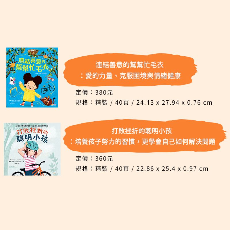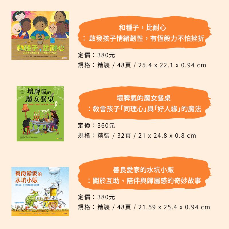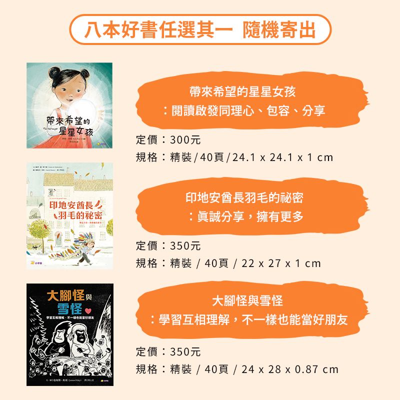 《大腳怪與雪怪》《壞脾氣的魔女餐桌》《和種子,比耐心》《善良愛家的水坑小販》《連結善意的幫幫忙毛衣》《打敗挫折的聰明小孩》八本好書不挑款、隨機出貨一本,