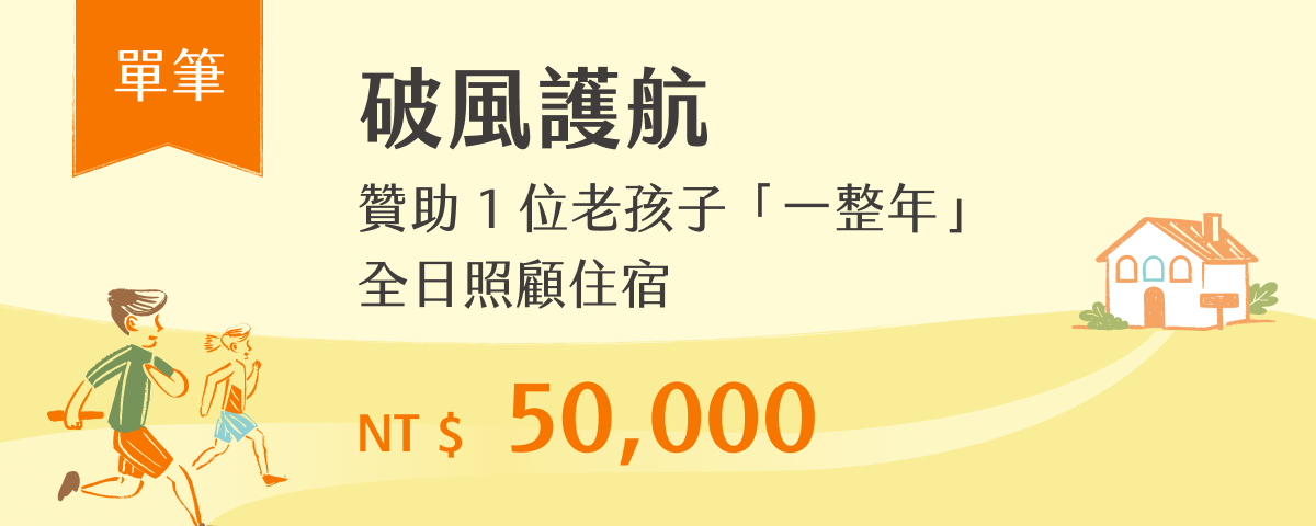 【破風護航】 贊助 1 位老孩子「一整年」全日照顧住宿