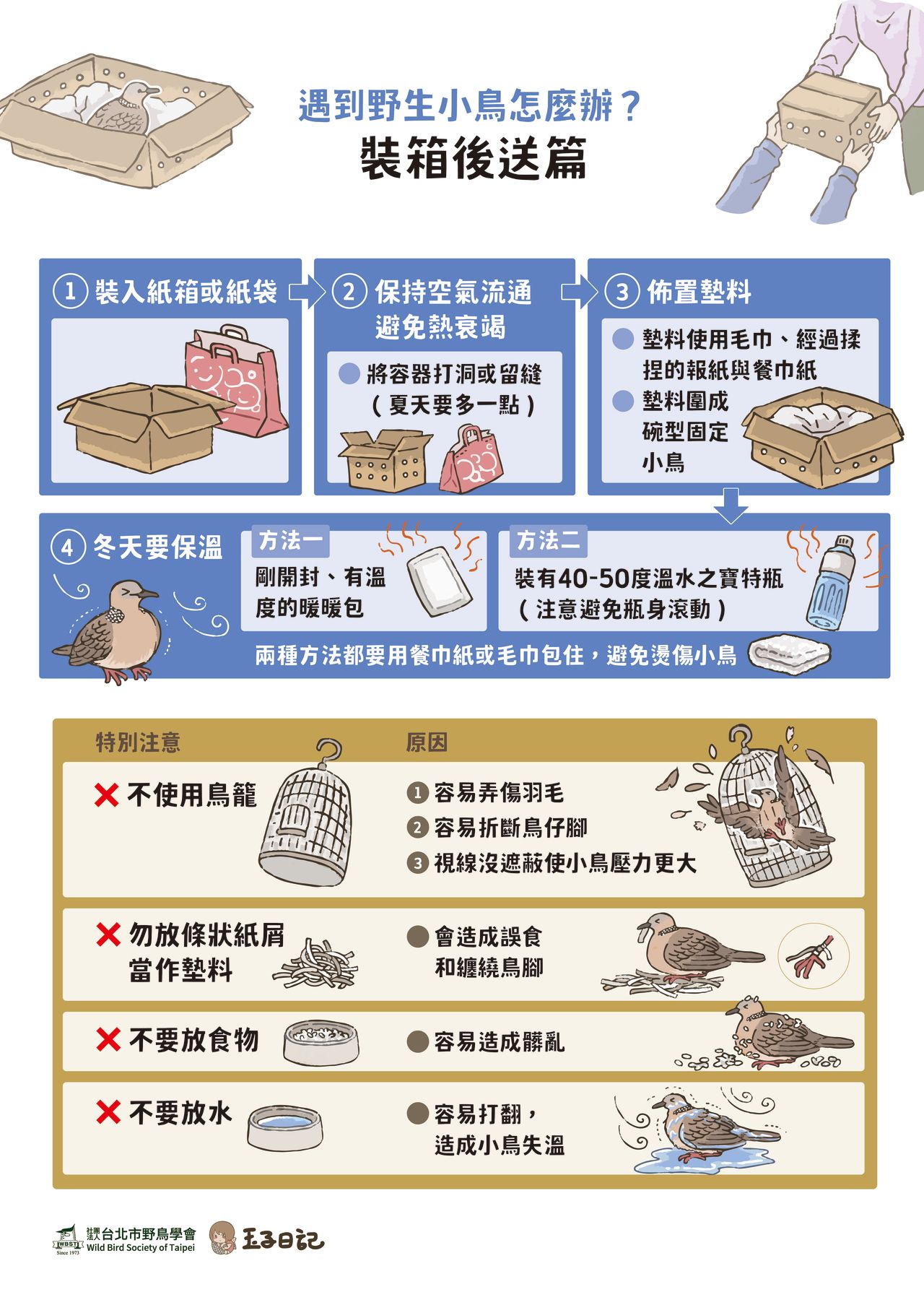 包含常見雛鳥特徵、成鳥帶領幼鳥學飛之互動漫畫、提供雛鳥救援/安置模式建議,以及不同傷病況的安全處置步驟。