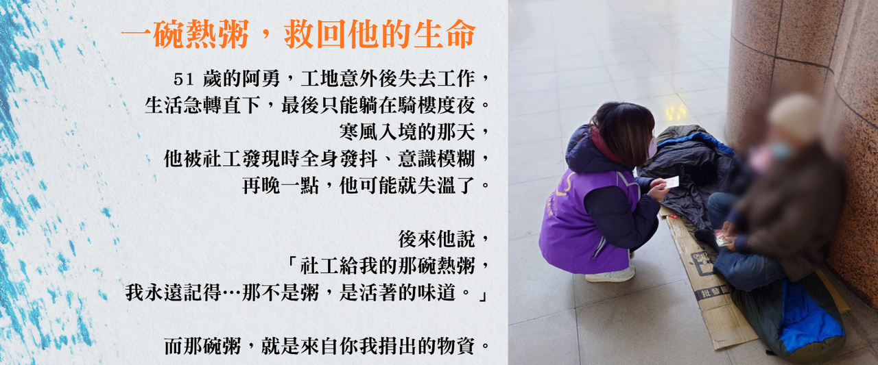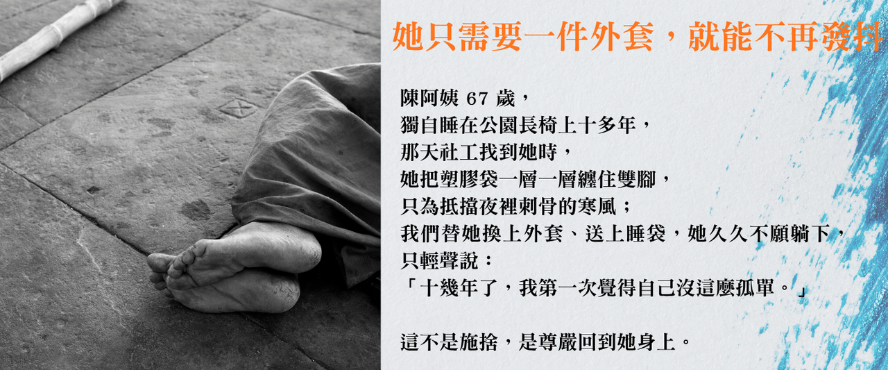 這個冬天,請和我們一起,讓街友活下去!30 萬元,撐起冬夜裡的生命線,你的一份溫暖,就是他們明天還能醒來的力量。
