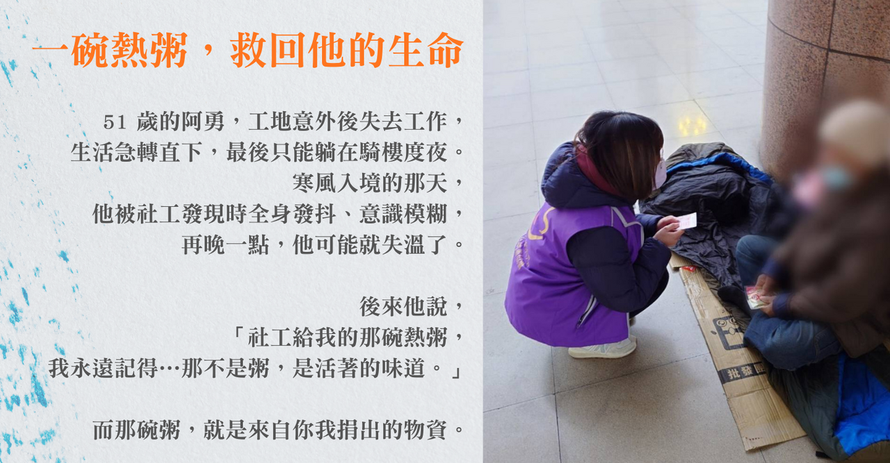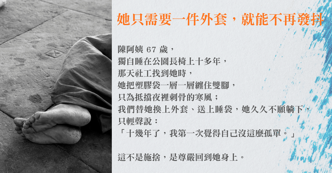這個冬天,請和我們一起,讓街友活下去!30 萬元,撐起冬夜裡的生命線,你的一份溫暖,就是他們明天還能醒來的力量。