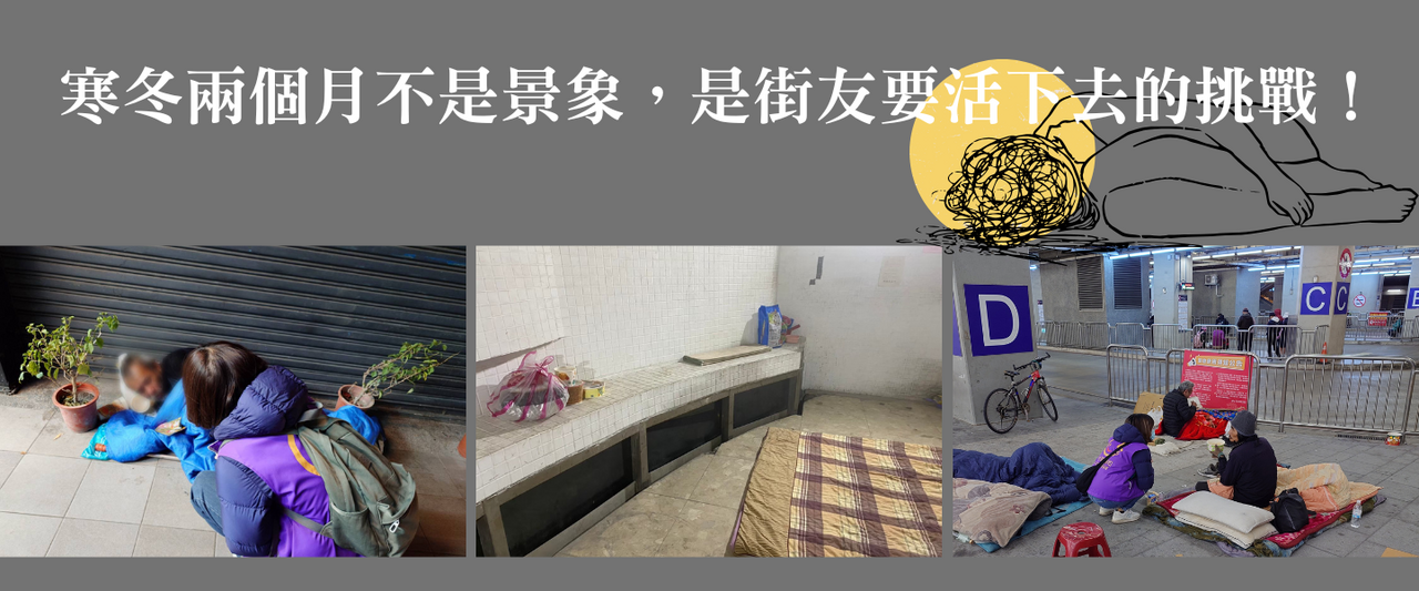 每年從 11 月下旬到翌年 1 月底,是街友最艱困的時間。白天寒風刺骨,夜裡溫度直直落,但真正殘酷的,是沒有禦寒裝備、沒有熱食、沒有可以安心睡一晚的地方。農曆年前後,街頭會變得更荒涼,店家休息、熱食難尋、公共資源縮減,這段日子,街友最常說的一句話是:「我不是冷到受不了,就是餓到撐不住。」
